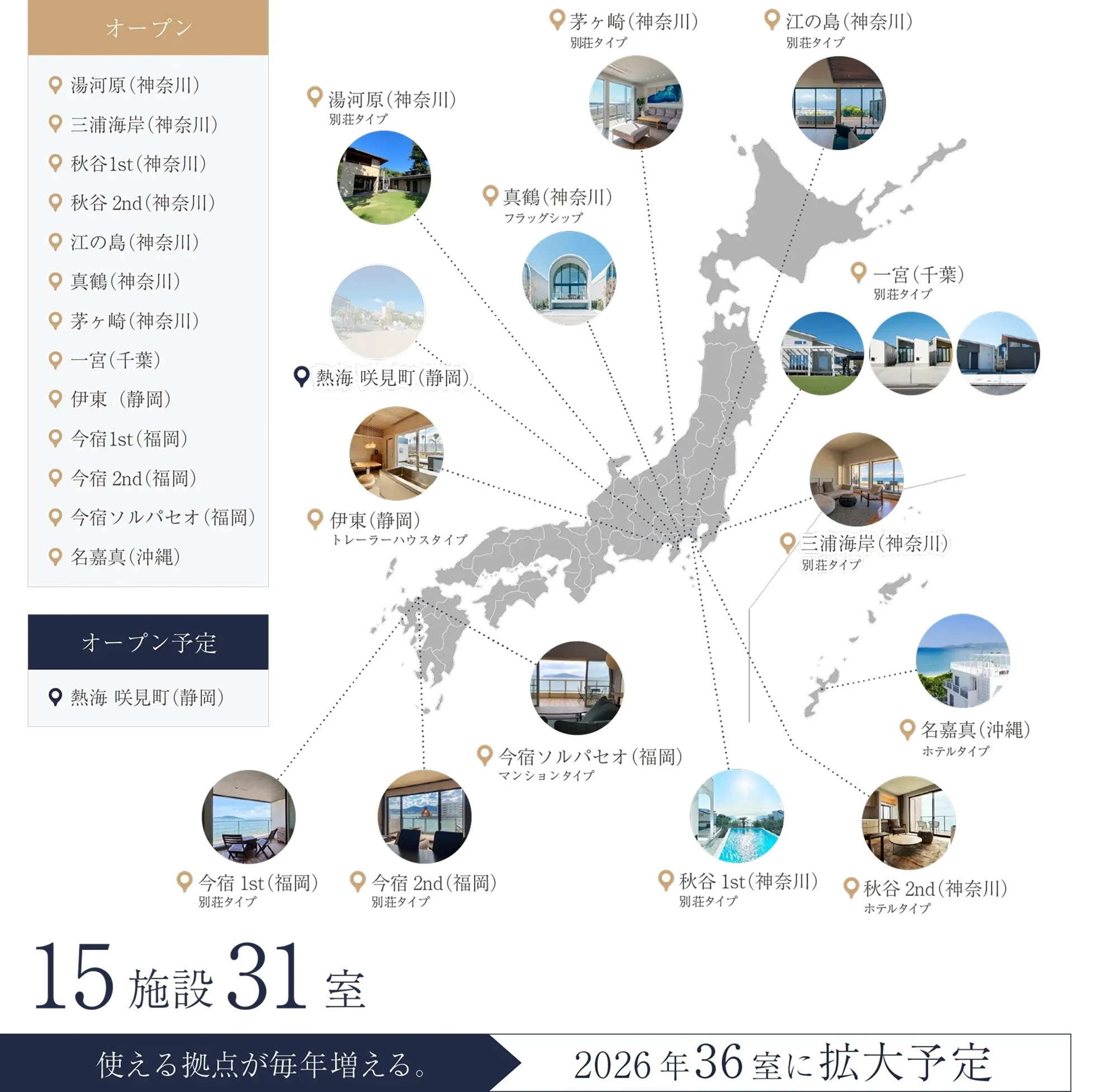 - ※施設により、面積や設備、宿泊費設定などが異なります。