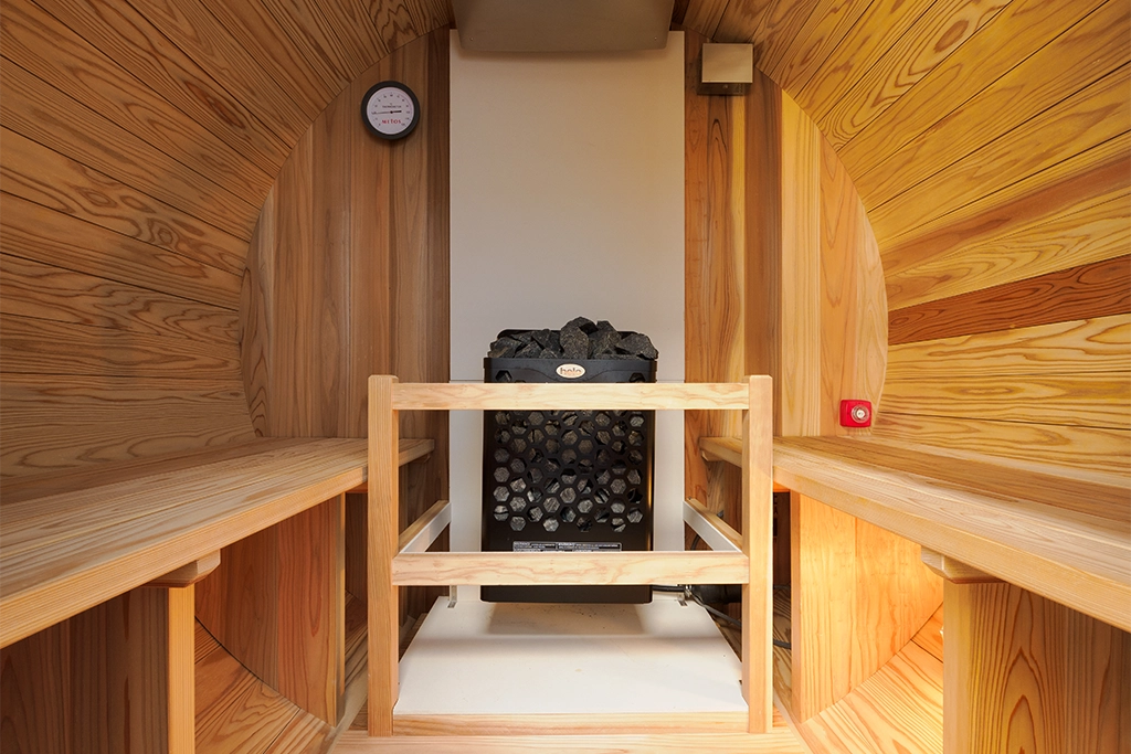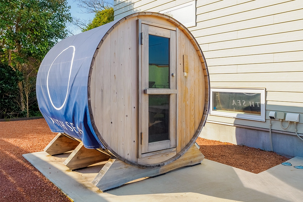 別荘横にはバレルサウナが設置されています。 バレルサウナはサウナ内の熱が壁に沿って均一に伝わるため、場所による温度のムラを抑えてくれます。 国産木材を活用した地産地消、さらにハンドメイドというこだわりずくしのサウナです。