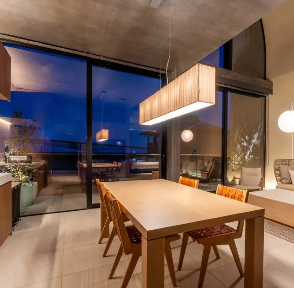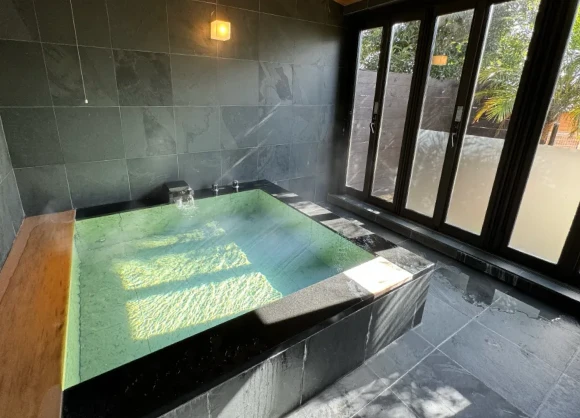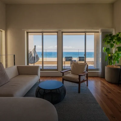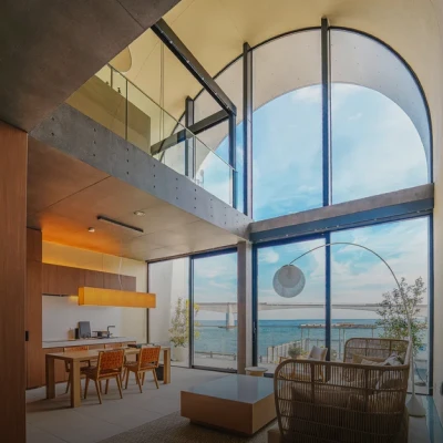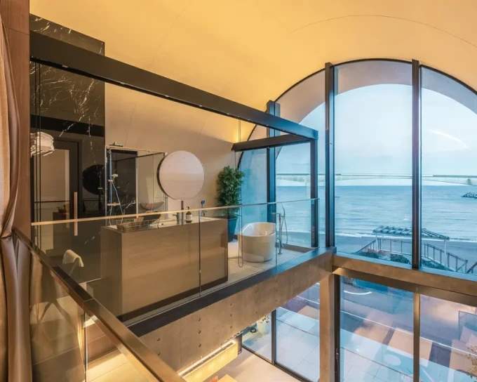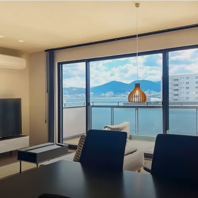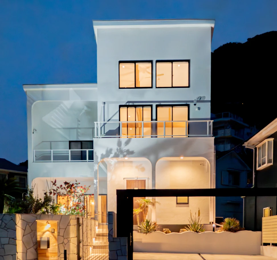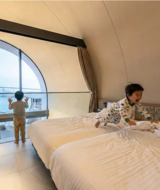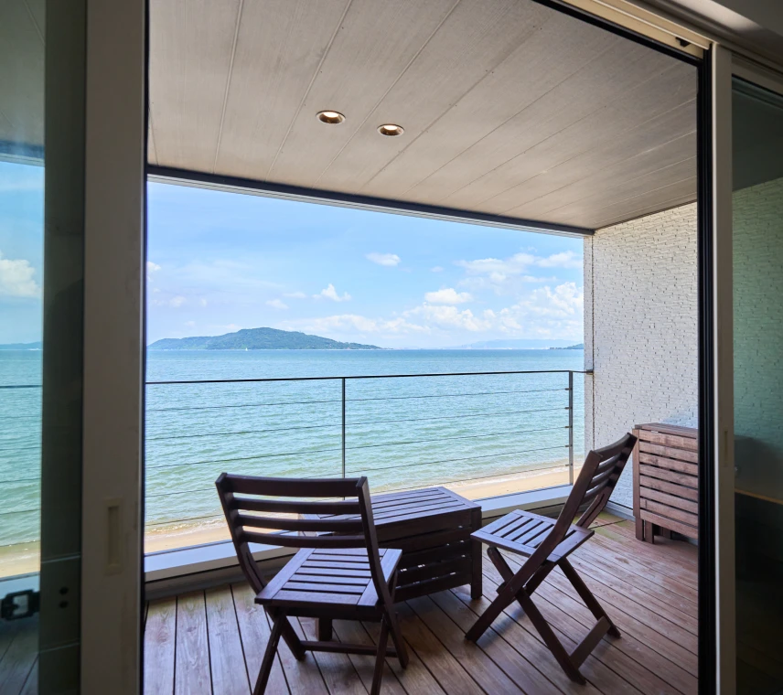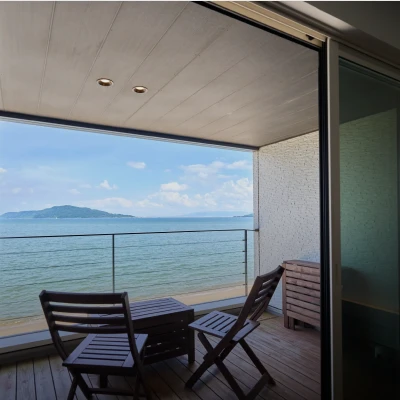 「家族4人でWITH SEAのフラッグシップに滞在しました。昼間の海の眺望も素敵ですが、夜の照明に照らされた室内空間もとても魅力的でした。ベッドも寝心地がよく、波音を聴きながら朝まで快眠でした。プライベートサウナはシャワーや水風呂の導線も含めとても理想的で、大満足の滞在となりました。」