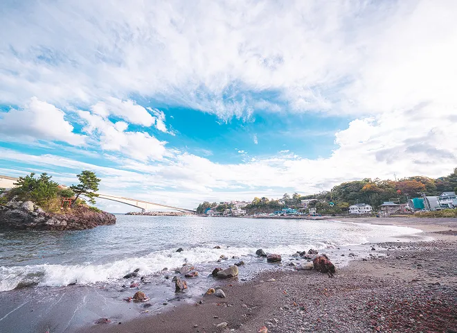 相模湾を望む静かな海辺で、