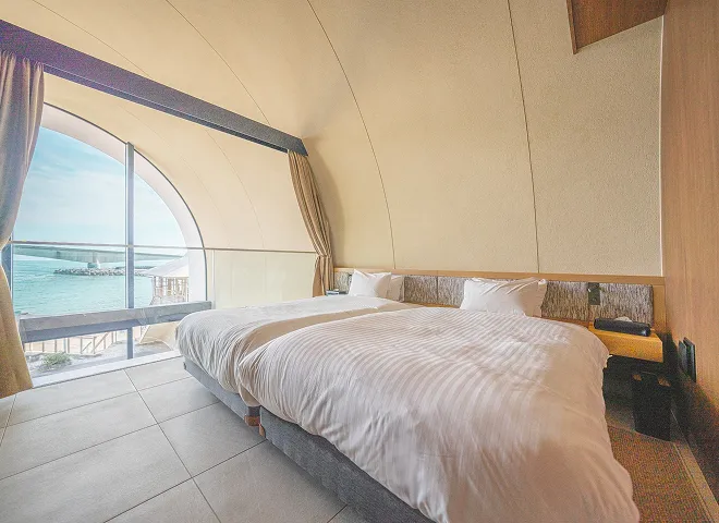 ガラス越しに広がるオーシャンビューと心地よい潮風が、