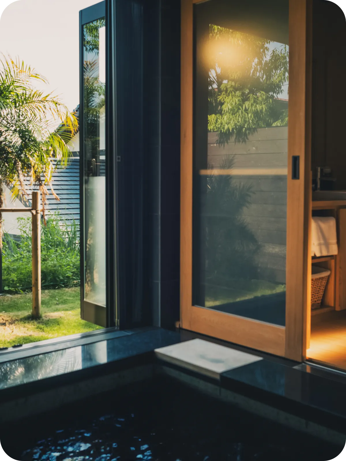 プライベートプールから海に沈む夕日を眺める至極の贅沢空間。