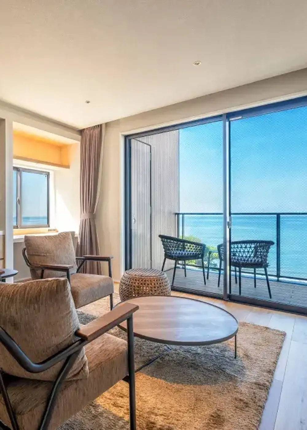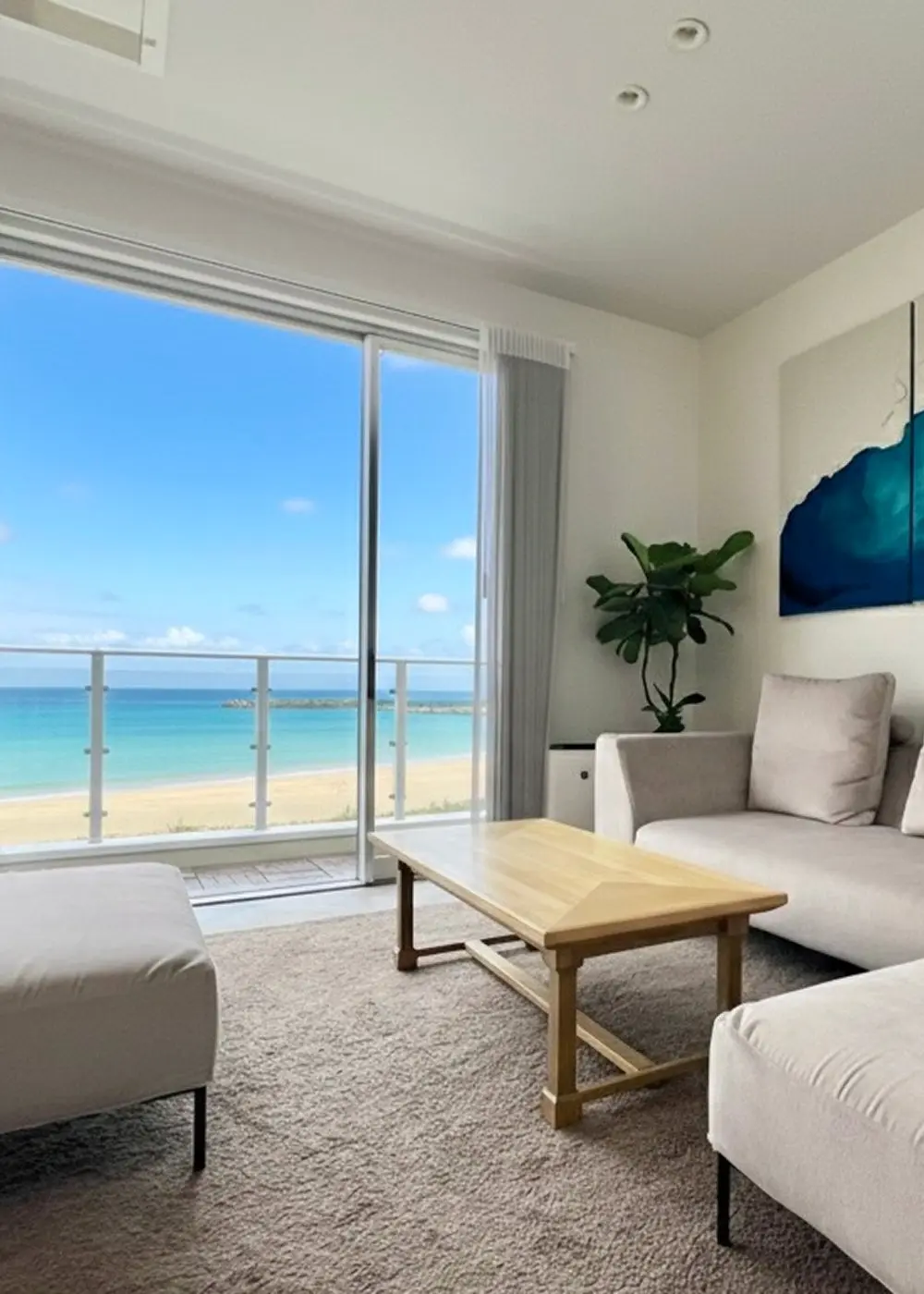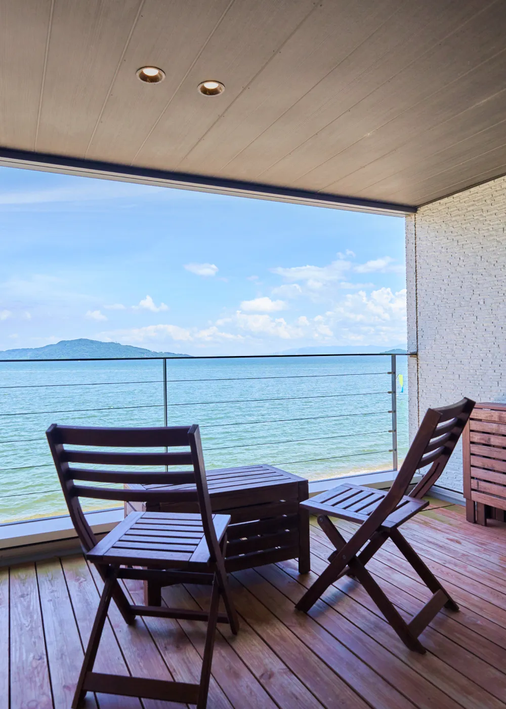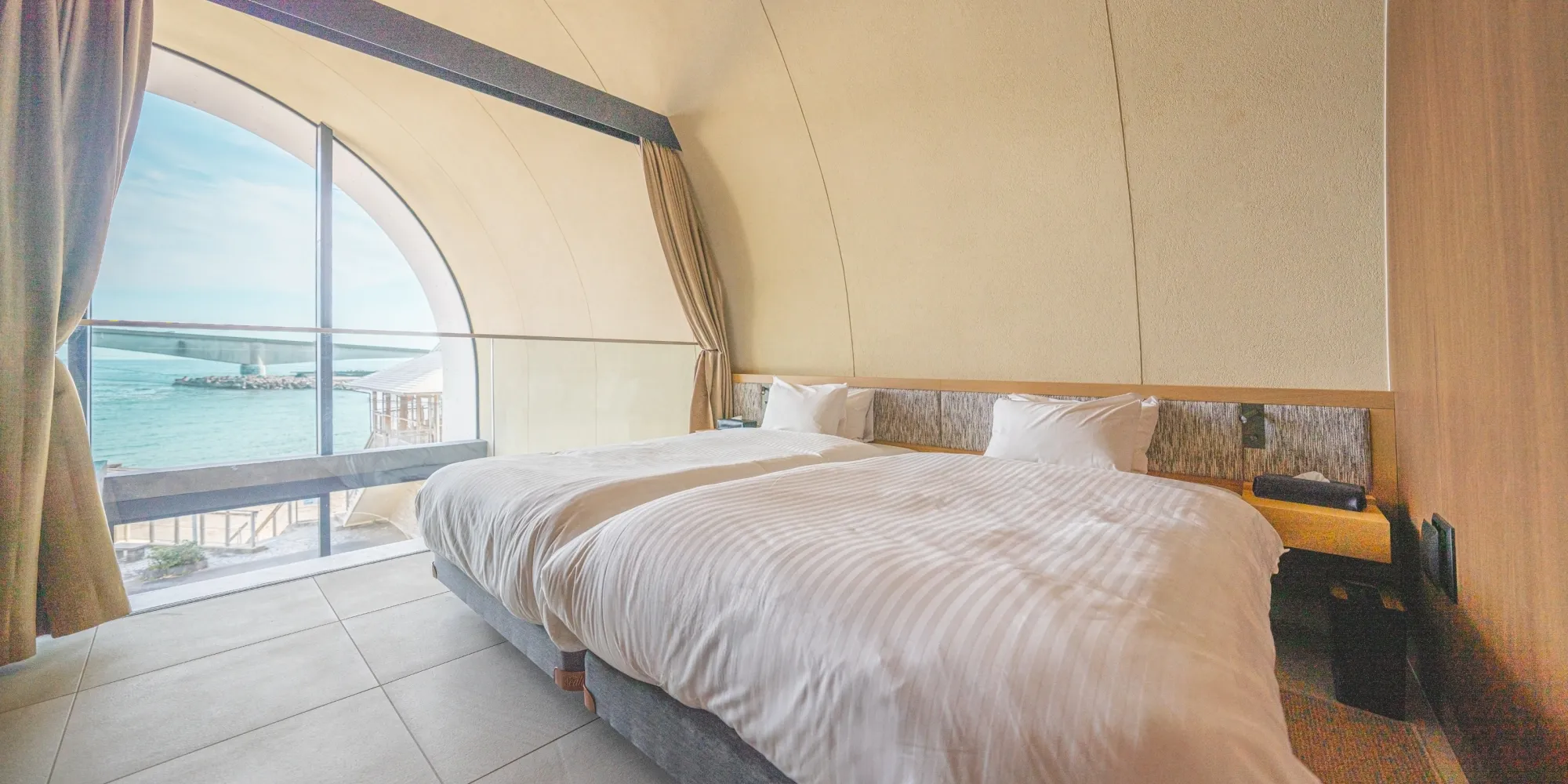 ガラス越しに広がるオーシャンビューと心地よい潮風が、