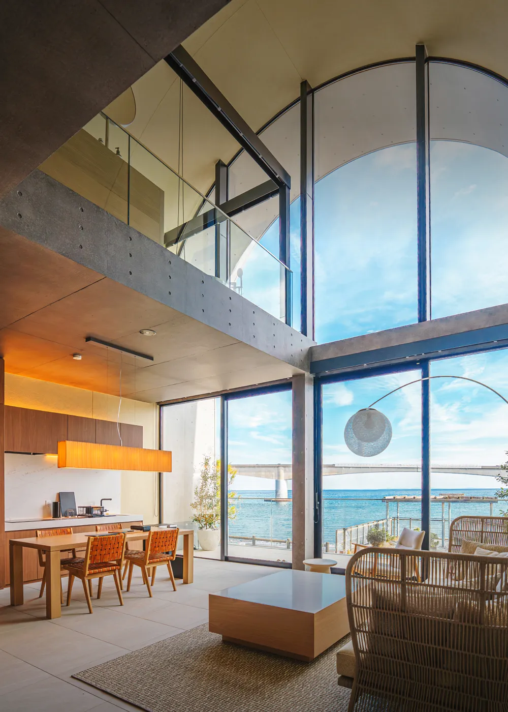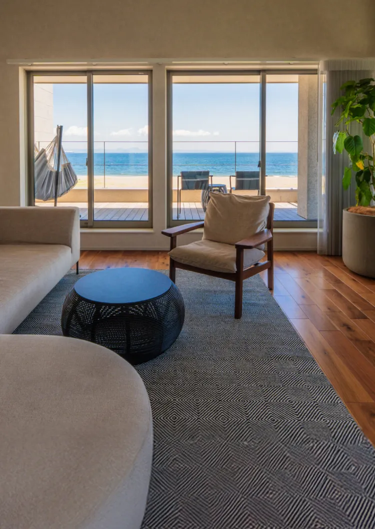 海最前列のロケーションで、ガラスのカーテンウォール越しに海を眺めながらリラックスした時間を過ごす家。